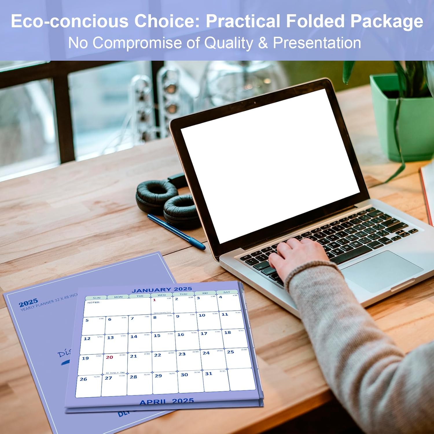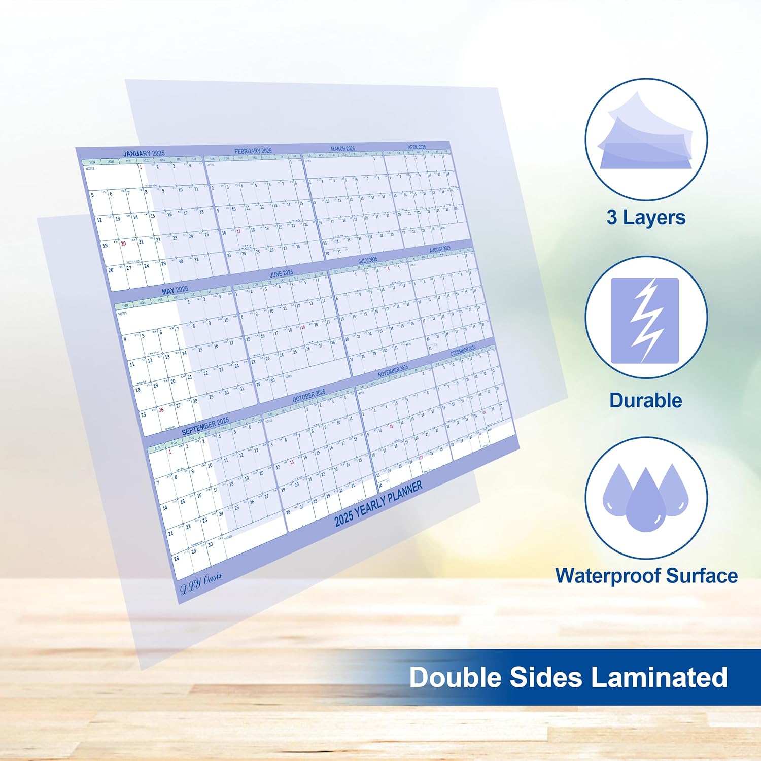 Stay organized all year with the DLY Oasis 2025 Wall Calendar. Measuring a generous 32" x 48", this laminated calendar is compatible with both wet and dry erase markers for easy updates. Featuring a clean, foldable design and Julian date format, it's ideal for tracking appointments, goals, and events at home, in the office, or classroom. Use it horizontally or vertically to best fit your space.