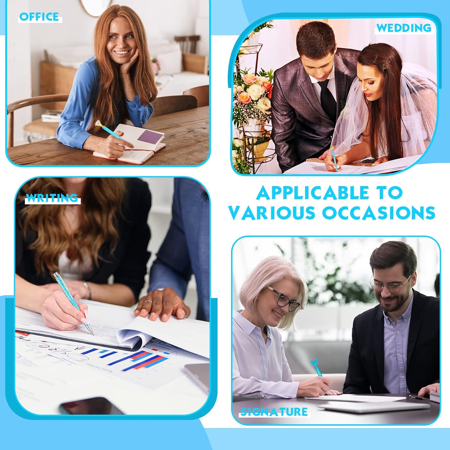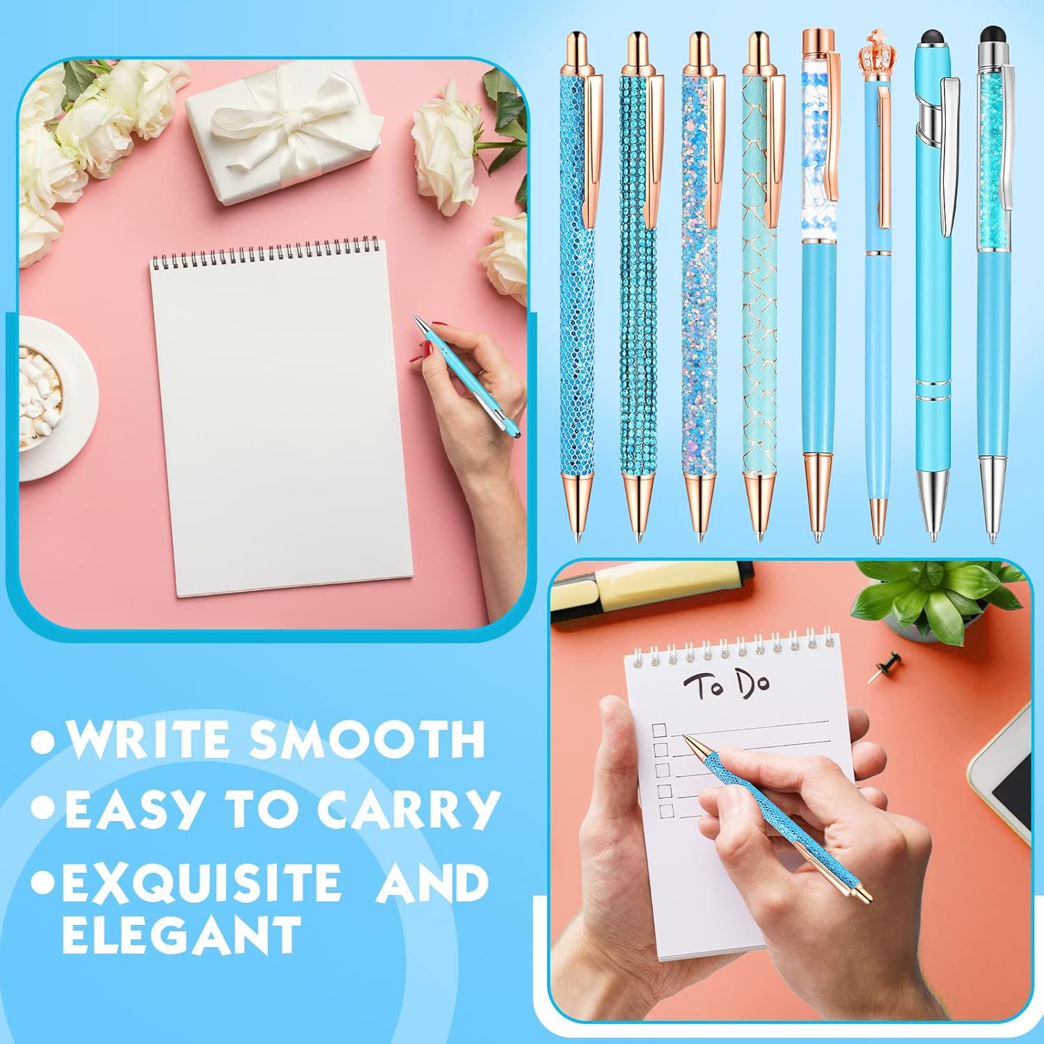 Add sparkle to your stationery with this 11-piece Estune Diamond Pen Set. Each pen features a stunning crystal top, liquid sand glitter design, and a sleek metal barrel. These stylish ballpoint pens use smooth-flowing blue ink and are perfect for office supplies, school, wedding favors, or as a chic desk accessory.