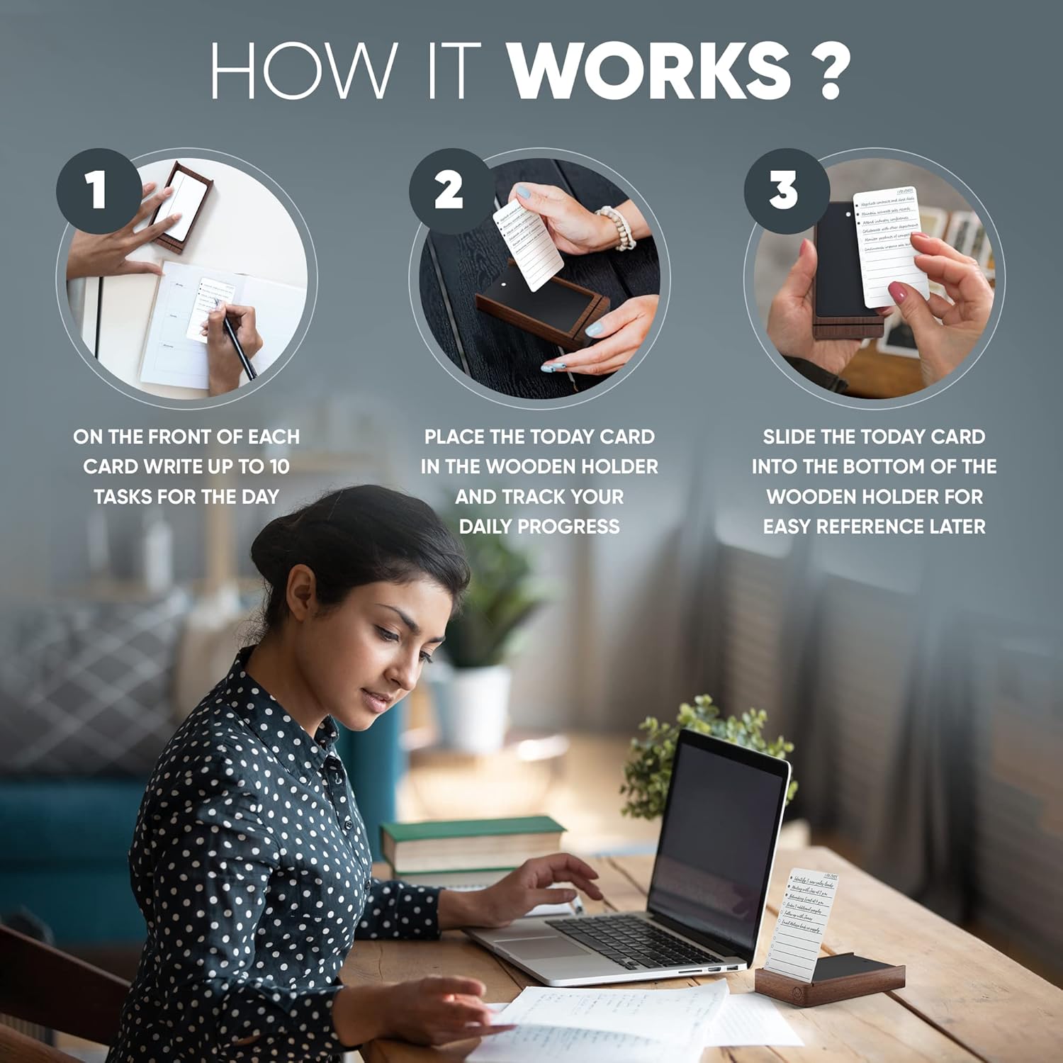 • Includes: 120 Daily Checklist Cards, 10 Goal Cards, Walnut Stand