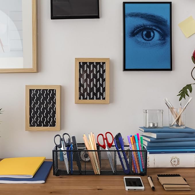 Keep your desk neat and organized with the Teling Mesh Desk Organizer. This set includes two sturdy metal holders, each featuring 6 compartments for easy organization of pens, pencils, markers, and other office supplies. Ideal for home or office use, these sleek black organizers help maximize desk space.