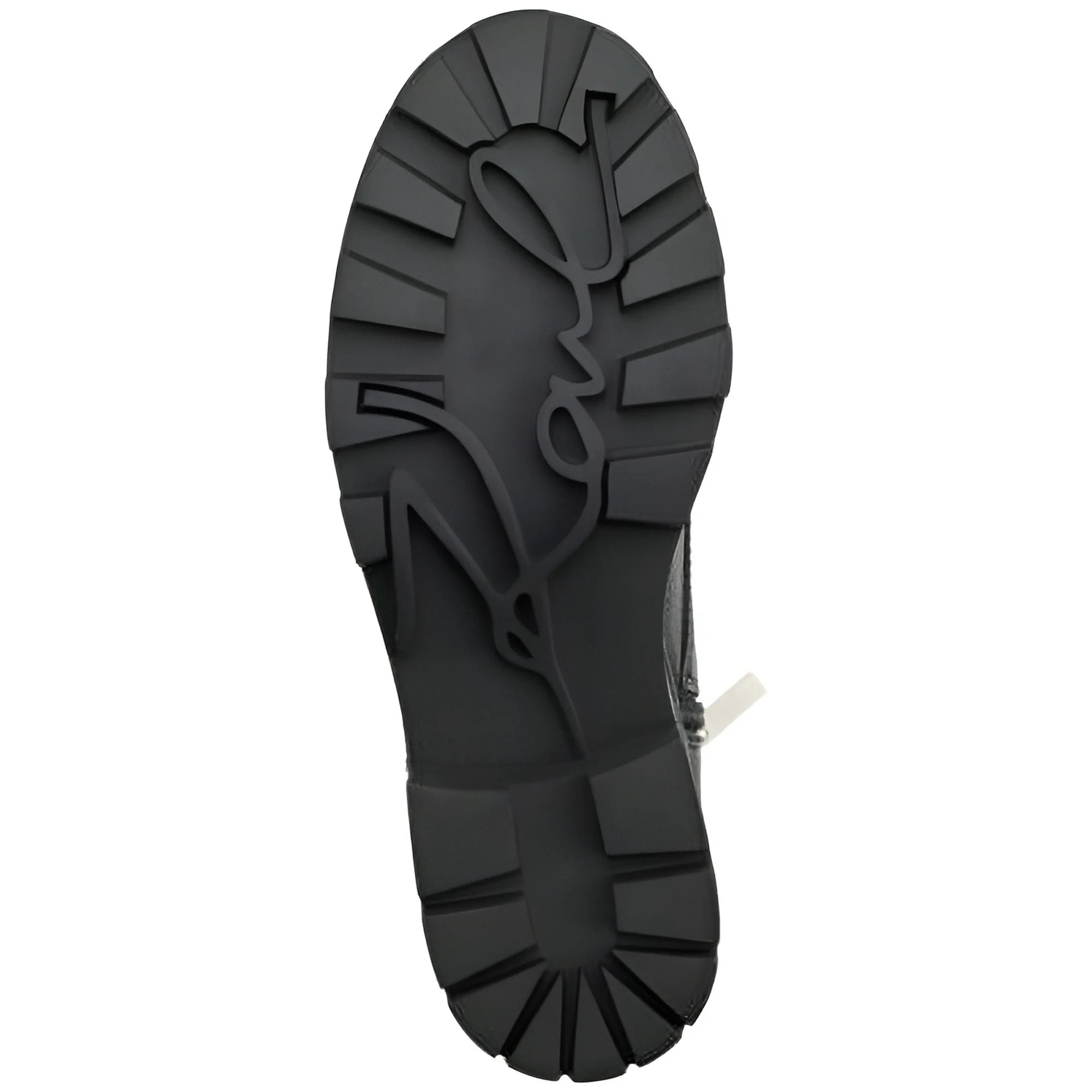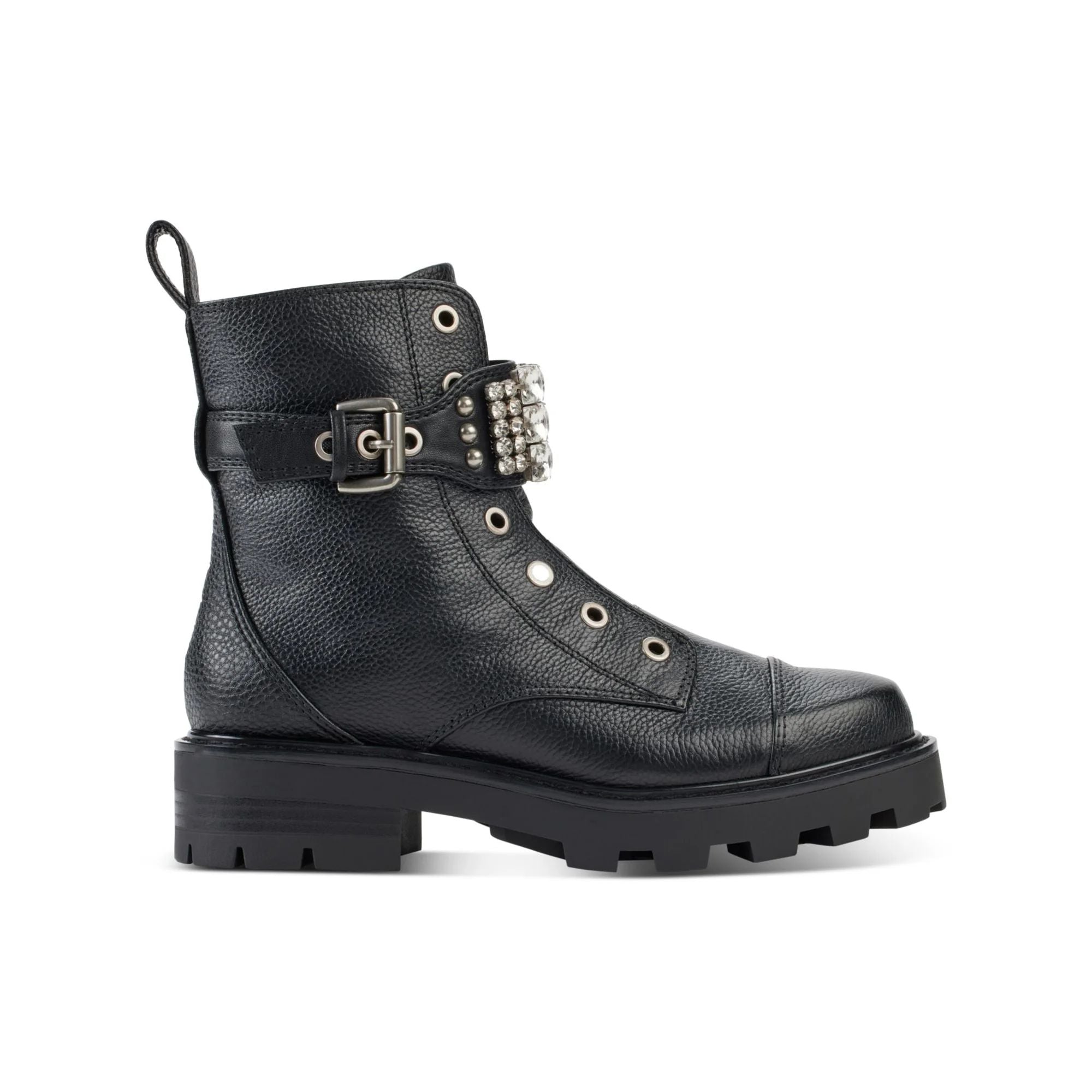 Step out in sophisticated style with the KARL LAGERFELD PARIS Maeva Booties. These black leather ankle boots feature buckle and eyelet embellishments, a sleek round toe, and a sturdy block heel for a fashion-forward yet comfortable look. The zip-up closure ensures easy wear, making them perfect for any occasion, from casual outings to stylish evenings.