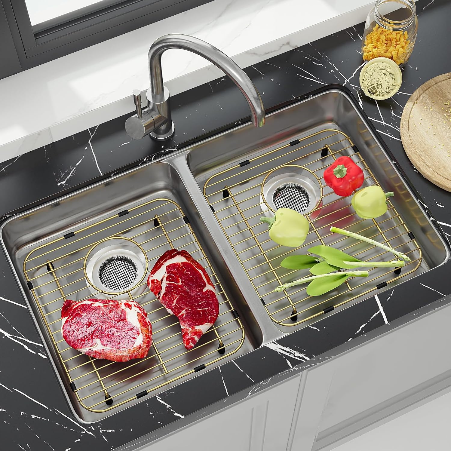 Protect your kitchen sink and enhance its look with universal sink protectors. Designed for double bowl sinks with an offset drain, this 2-pack features a durable golden stainless steel finish. The 11.6" x 13.12" grids prevent scratches and allow water to drain efficiently, making them ideal for everyday kitchen use.