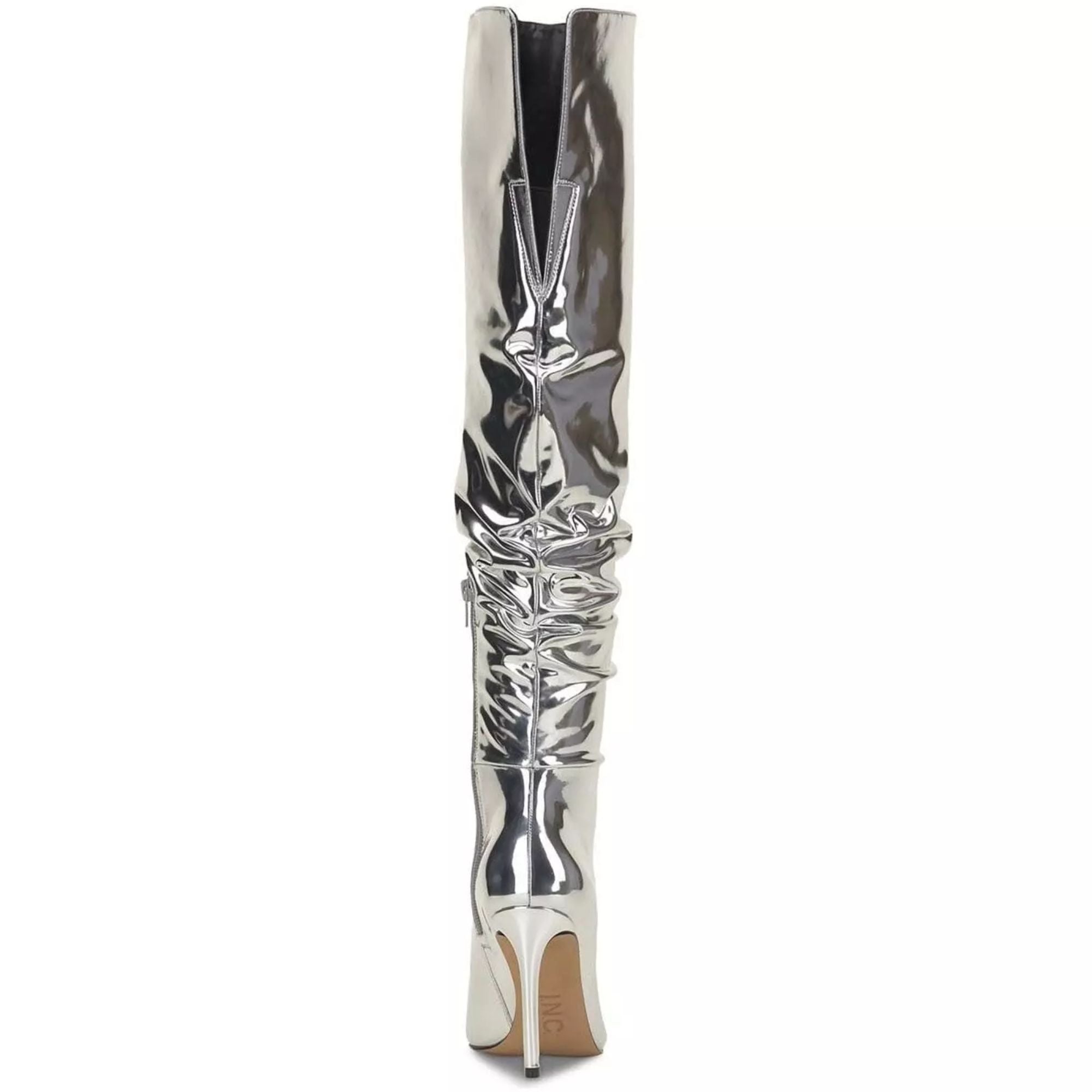 Make a bold fashion statement with the Iyonna Over-the-Knee Slouch Boots from I.N.C. International Concepts. Featuring a high-shine silver patent finish, these glamorous boots bring a touch of drama to any outfit. The slouchy over-the-knee silhouette combined with a sleek pointed toe and stiletto heel creates an ultra-chic, head-turning look. A convenient side zipper closure ensures easy on and off, making them as functional as they are stylish.