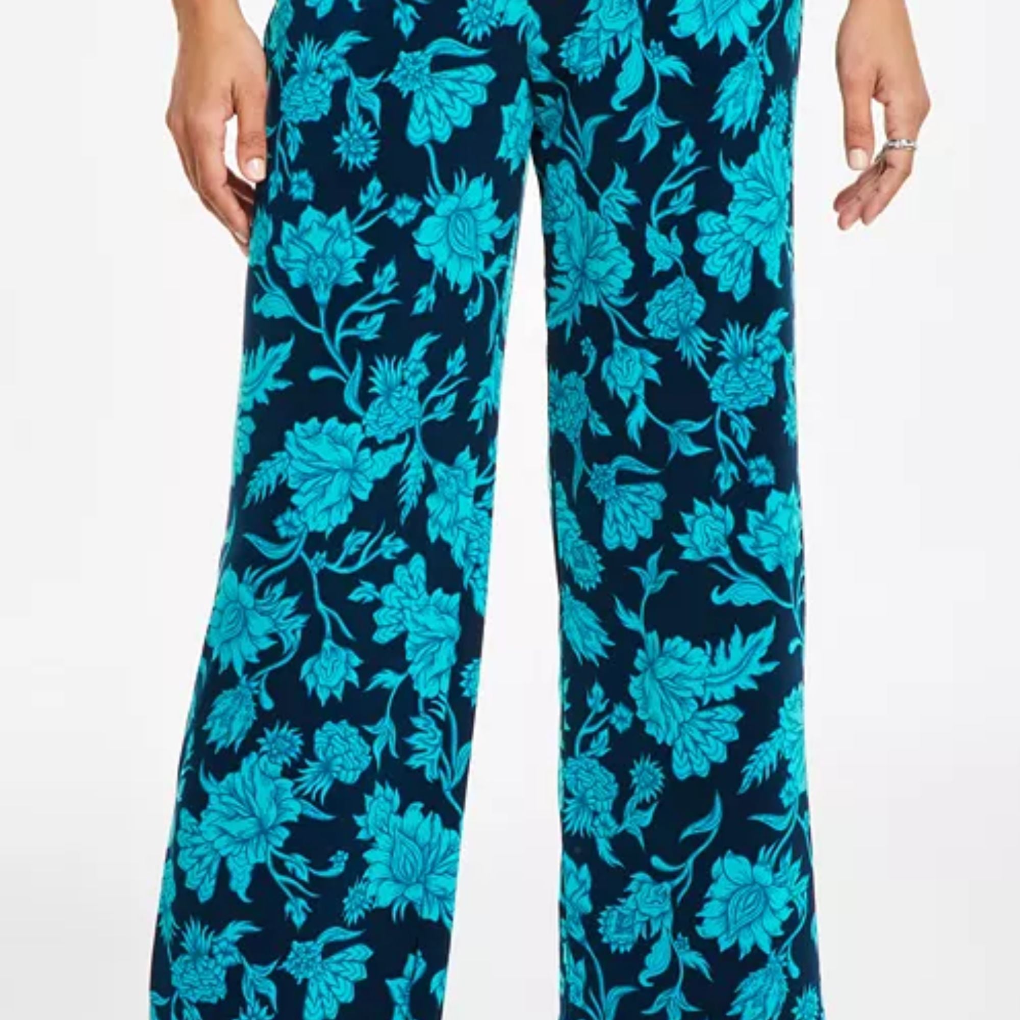 Step into effortless style and comfort with the JM Collection Women's Elena Printed Wide-Leg Knit Pull-on Pants in Intrepid Blue Combo. These soft and stretchy knit pants feature a chic wide-leg silhouette and a pull-on design for all-day ease. The bold navy print adds a fashionable touch, making them perfect for casual outings or lounging in style.